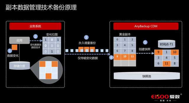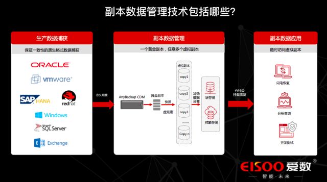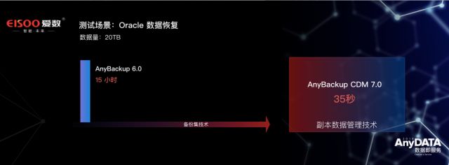2018年6月7日,上海浦东嘉里大酒店,爱数AnyDATA 2018大会上,AnyBackup CDM在两千余人的见证下,完成了现场备份和恢复20TB Oracle数据库数据的挑战,并以备份耗时1分11秒,恢复耗时35秒的精彩战绩,震惊现场。 Oracle增量备份:1分11秒 Oracle异机恢复:35秒 那么,AnyBackup CDM为何可以如此高效? 因为不同于基于备份集技术,AnyBackup CDM采用的是副本数据管理技术。 什么是副本数据? 副本数据从生产环境通过快照技术获取有应用一致性保证的数据,主要存储在非生产存储系统上,分流生产环境的访问压力,以及用于灾难恢复等。副本数据包括一个黄金副本,黄金副本是克隆最近一个时间状态生产环境下的数据。黄金副本通过快照和虚克隆,可以生成任意多个虚拟副本,用于呈现某特定历史时间的数据。 副本数据管理技术的全流程是什么? 副本数据管理技术覆盖从生产数据捕获到副本数据管理再到副本数据应用的全过程,尤其是核心业务,通过保证一致性的原生数据的抓取,并应用永久增量备份技术传输变化的数据块,生成一个黄金副本,再采用虚克隆技术,克隆出多个虚拟副本,分别用作闪电恢复,分析查询,开发测试等。 副本数据管理技术到底有什么优势? 相对于基于备份集技术,副本数据管理技术具有三大优势。 第一,无论多大的数据量,恢复时间都是分钟级。 第二,备份后的数据可以有更多使用用途,包括测试数据验证、大数据分析抽取等。 第三,副本数据管理技术是二十年存储技术的结晶。 副本数据管理技术可以说是备份行业跨时代的发明。因为海量数据时代,需保证足够大的存储容量(PB级);需保证足够多的历史时间版本;需保证最大化的数据压缩比。所以它不仅要依赖于分布式文件系统来解决海量数据存储问题,还要提供能保留非常多历史副本的存储快照技术,并保证性能不会缩减,除此之外还要具备优异的重复数据删除技术。并且,这三个特性需要在同一个文件系统中实现。 AnyBackup CDM快照存储系统有何不同? AnyBackup CDM快照存储系统正是集上述三个特性于一体的新型文件系统,它具备如下三大特性: 首先,它是真正的分布式文件系统。由于是去中心化,没有单点的性能瓶颈,足以支撑海量数据存储。 其次,它拥有无限的快照技术。当数据量不断增加时,依旧可以保证性能。而传统快照技术之间拥有相互依赖关系,随着快照副本的不断增加,会产生性能衰减,导致无法使用等情况。 再次,它支持跨节点的在线重复数据删除技术,重删比较传统重复数据删除高20-30%。 AnyBackup CDM备份只需1分11秒的核心技术是什么? 备份是高频动作,每天我们都要做备份,网络带宽是瓶颈,所以需要解决两大关键问题,一是备份尽量少的数据,二是在海量数据下,如何快速找到想要备份的数据。因此,AnyBackup CDM在海量数据备份过程中有两个关键技术,一是变化位图,当生产环境中数据发生变化时,变化位图能帮助快速找到需要备份的数据。二是永久增量备份,即每天做备份时,只备份变化的数据块,整体性能提升了300多倍。 AnyBackup CDM恢复只需35秒的核心技术是什么? 传统恢复也有两大瓶颈。一是由于历史时间版本数量多,恢复时,需要做解包动作,且相互关系,也就是说,要找出需要恢复的数据,花费的时间相当长。二是在恢复过程中,所有数据必须经过网络传输后,业务才能进行使用,耗时非常久。AnyBackup CDM解决了这两大难题,通过无限快照技术,不需要做频繁的计算就能找出所要恢复的数据。通过即时挂载技术直接把数据挂载出来给业务使用,而不是先将数据通过漫长网络传输后再使用。 综上所述,AnyBackup CDM主要通过副本数据管理技术,覆盖从生产数据捕获到副本数据管理再到副本数据应用全过程,打造海量数据时代的闪电恢复和高效数据利用,依靠变化位图,永久增量备份,挂载恢复,无限快照等技术, 创下了备份20TB数据只需1分11秒,恢复只需35秒的精彩战绩。
